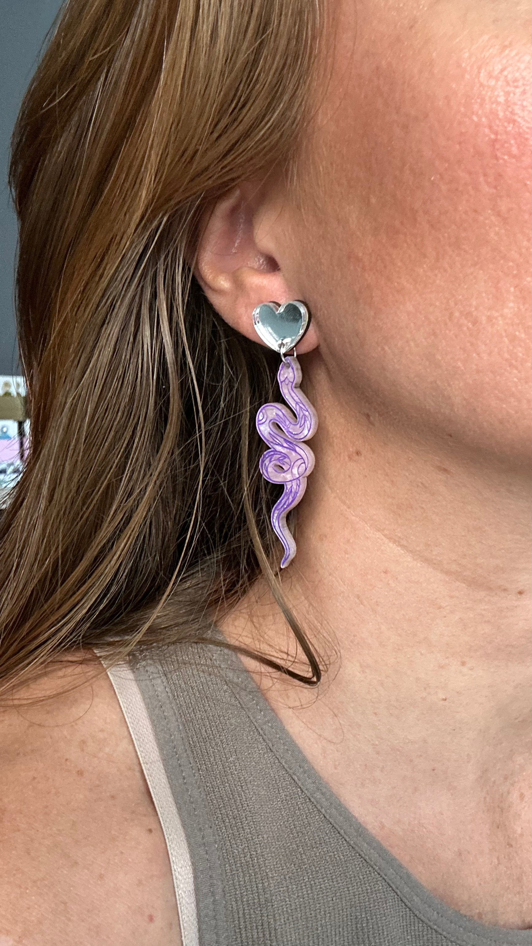 "Déjate envolver por el misterio con estos pendientes de serpiente en metacrilato grabado en lila 🐍✨. Su diseño hipnótico evoca la magia del otoño y el poder oculto de Halloween. Ligeros, atrevidos y únicos: un amuleto moderno para quienes se atreven a brillar con energía mística."
